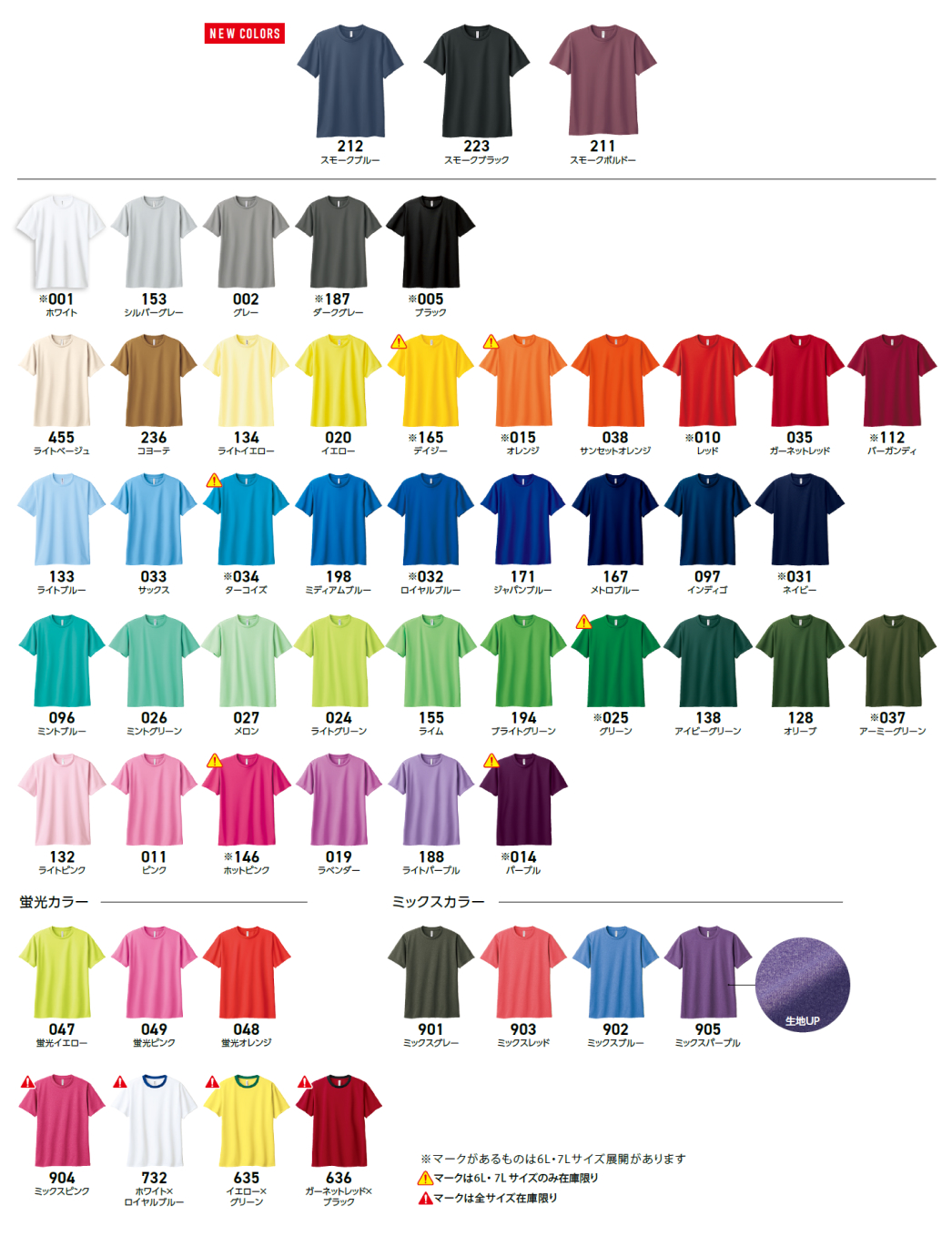 | 価格 | 通常色・蛍光色(100-150)¥814(税込)杢色(100-150) ¥1,133(税込)通常色・蛍光色(WM-LL) ¥853(税込)杢色(WM-LL) ¥1,188(税込)通常色・蛍光色(3L-5L) ¥1,084(税込)杢色(3L-5L) ¥1,403(税込)通常色(6L・7L) ¥1,370(税込)※プリント加工料金は含まれていません。 詳しくは料金表をご確認ください。 |