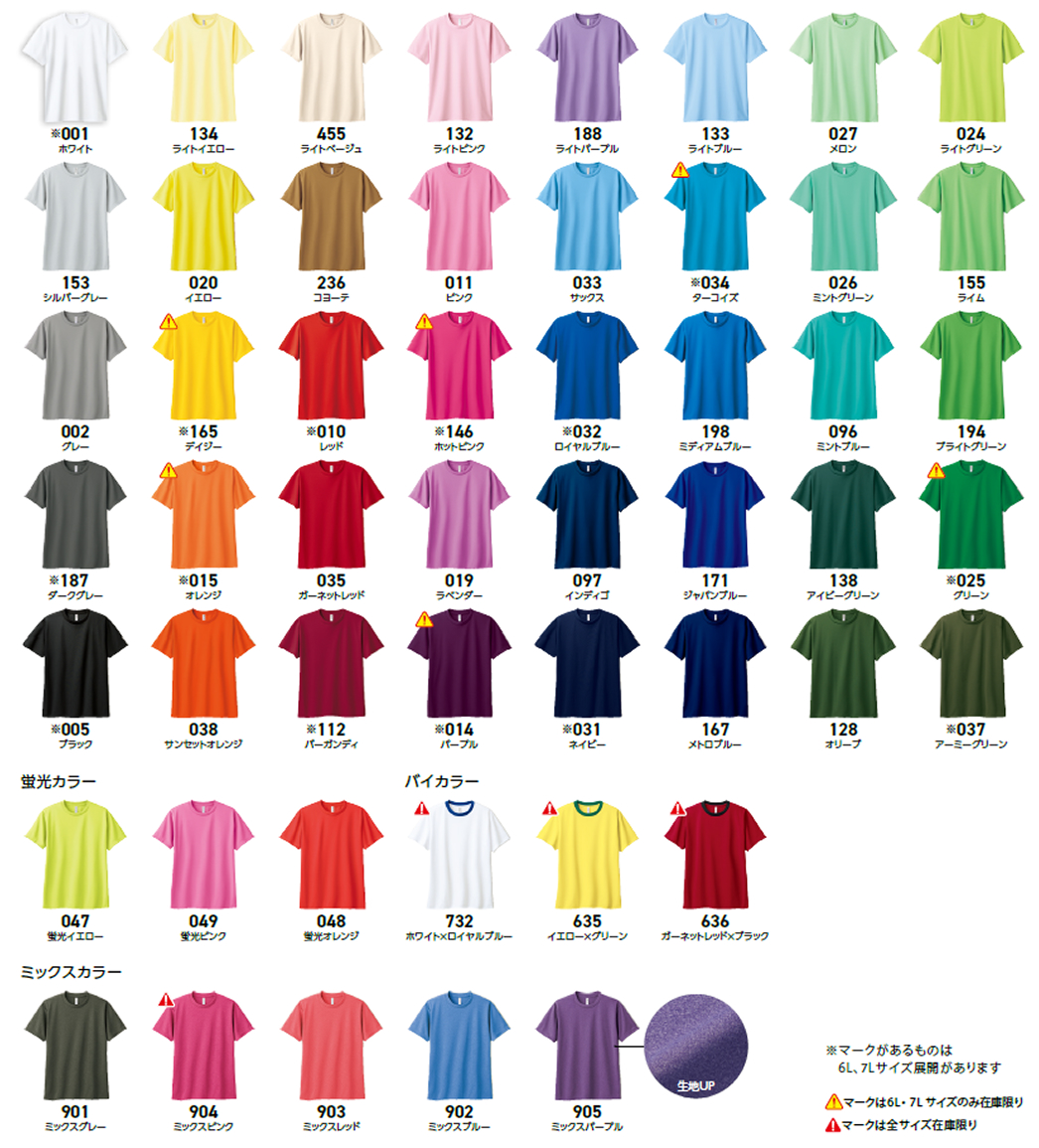 | 価格 | 通常色・蛍光色(100-150)¥781(税込)杢色(100-150) ¥1,067(税込)通常色・蛍光色(WM-LL) ¥809(税込)杢色(WM-LL) ¥1,100(税込)通常色・蛍光色(3L-5L) ¥941(税込)杢色(3L-5L) ¥1,183(税込)通常色(6L・7L) ¥1331(税込)※プリント加工料金は含まれていません。 詳しくは料金表をご確認ください。 |